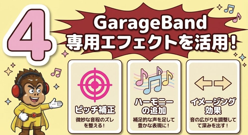 GarageBandのエフェクトを活用したボーカル調整:ピッチ補正やハーモニーの追加などを使って、ボーカルに表現豊かな要素を加えます。