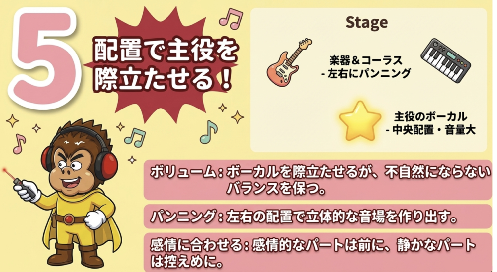 ボーカルの位置を左右に配置したり、立体的な表現をすることで、楽曲全体のバランスを調整します。
