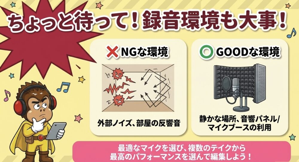 ボーカル録音時の注意点とコツ:適切なマイクの選定や環境整備、テイクの選定と編集が重要です。
