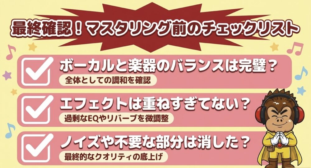 最終的に、マスタリング前に最終確認を行い、高品質なボーカルトラックを完成させましょう。