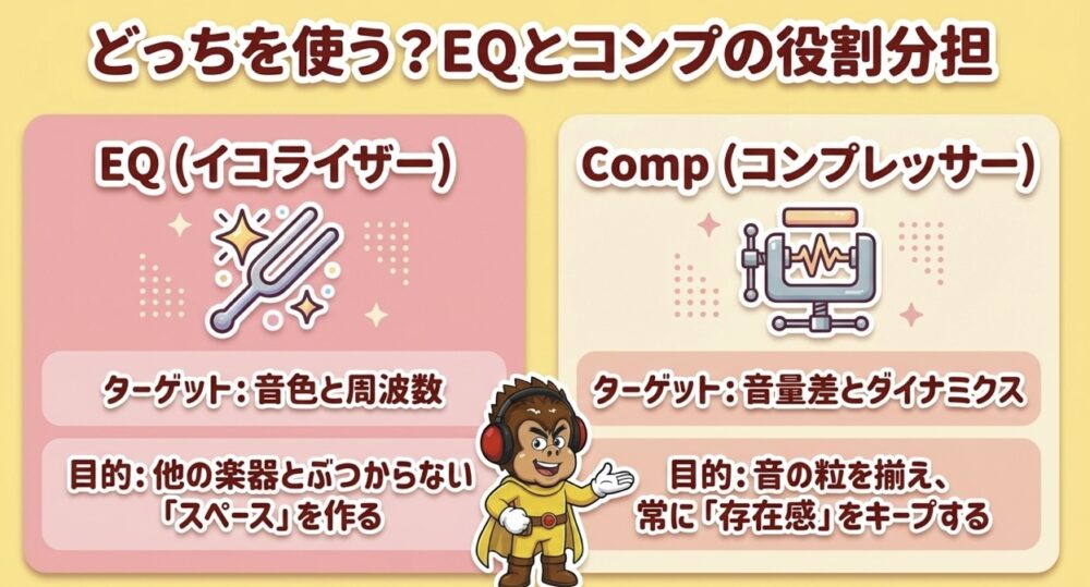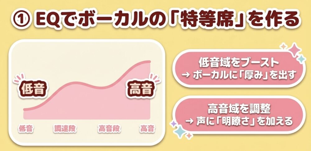 EQを使った調整:周波数のバランスを調整し、ボーカルと他の要素の調和を図ります。