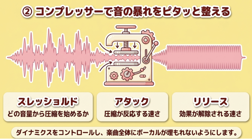 ボーカルトラックが楽曲全体に埋もれてしまう場合、コンプレッサーを使用して音の範囲を調整しましょう。