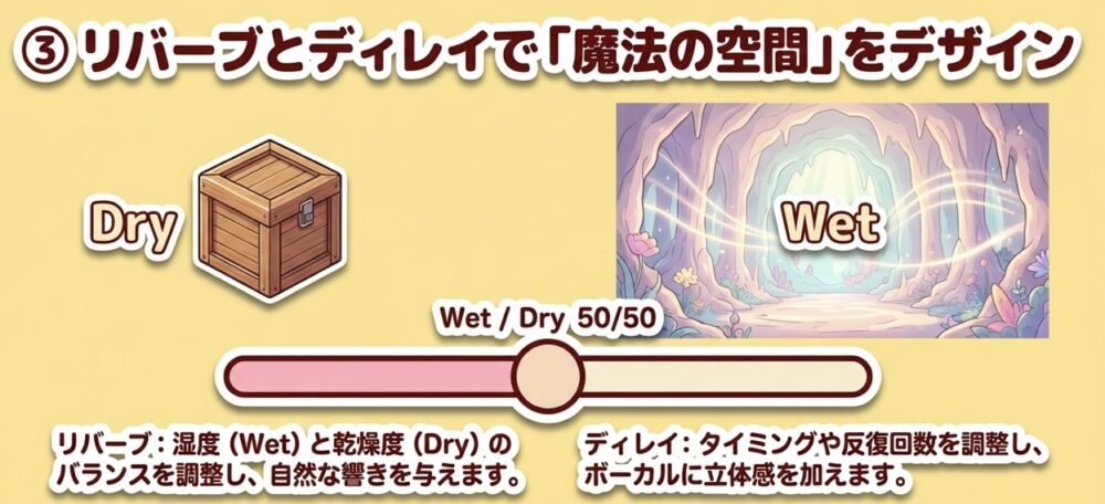 ボーカルが楽曲に馴染まない場合、適切にリバーブとディレイを使うことで、音の立体感を強調し、ボーカルを他の要素に統合することができます。