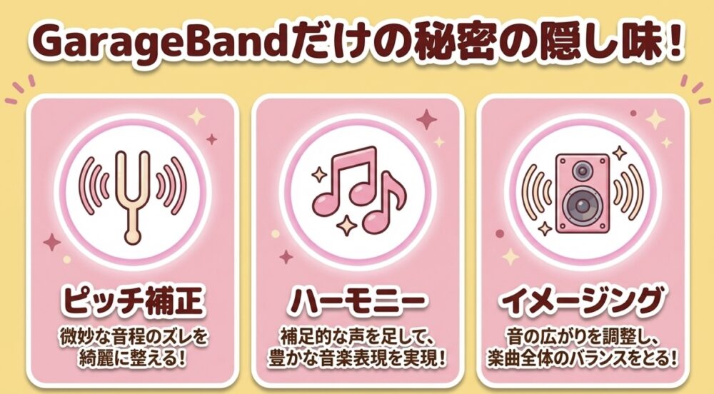 以下では、ピッチ補正、ハーモニーの追加、イメージング効果の活用について解説します。