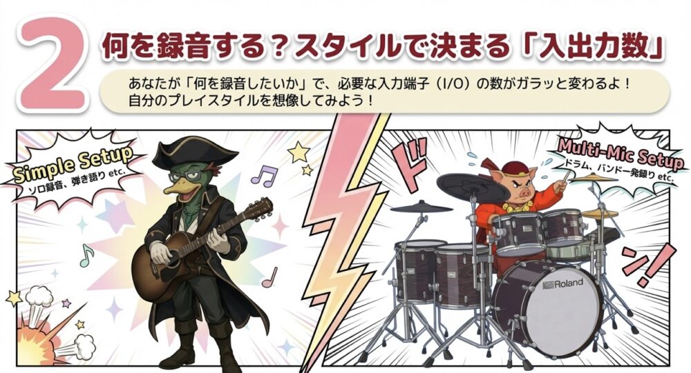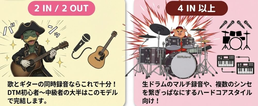 あなたが「何を録音したいか」によって、必要な入力端子の数が変わります。