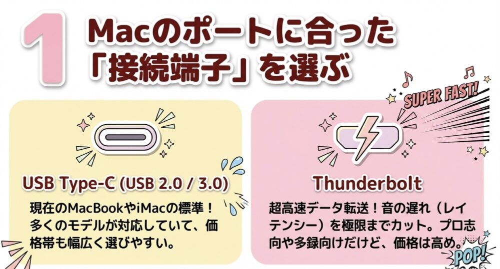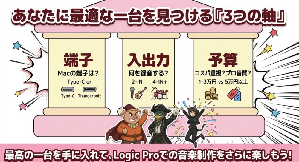 Logic Pro用のオーディオインターフェイスを選ぶ際は、「Macの接続端子」「必要な入力数」「予算」の3つを軸に絞り込んでいくと、スムーズに自分にぴったりの一台が見つかります。