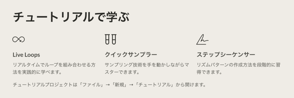 チュートリアルプロジェクトも用意されていて、Live Loops、クイックサンプラー、ステップシーケンサーの使い方を手を動かしながら学べます。