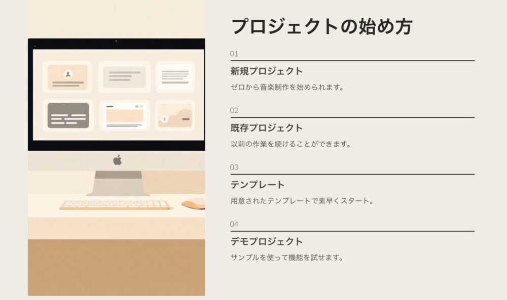 Logic Proを使い始めるときは、新しくプロジェクトを作るか、既存のものを開くことからスタートします。