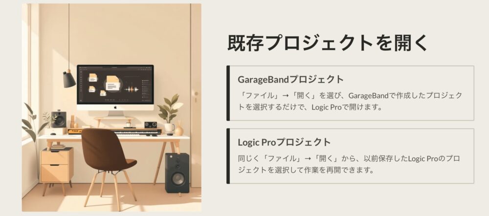 もしGarageBandを使っていたなら、そのプロジェクトをLogic Proで開いて、もっと高度な機能を使って作業を続けることもできます。