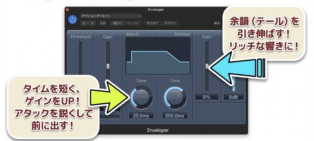 Enveloperを使いこなすコツは、過度なエフェクトとしてではなく、トランジェント・デザイナーとして音の輪郭を浮き彫りにすることにあります。