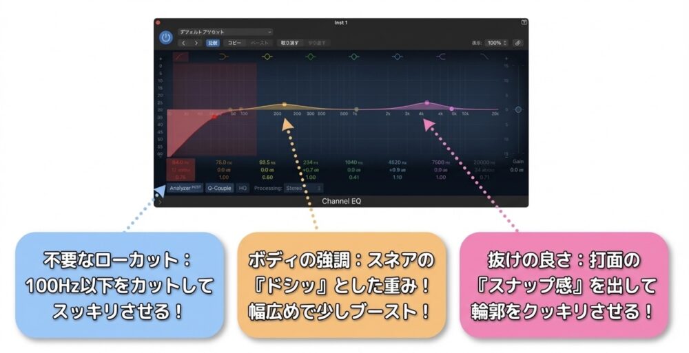 EQによる最終調整は、スネア単体の音作りというよりも、楽曲全体の中での「居場所」を確定させる作業なのです。
