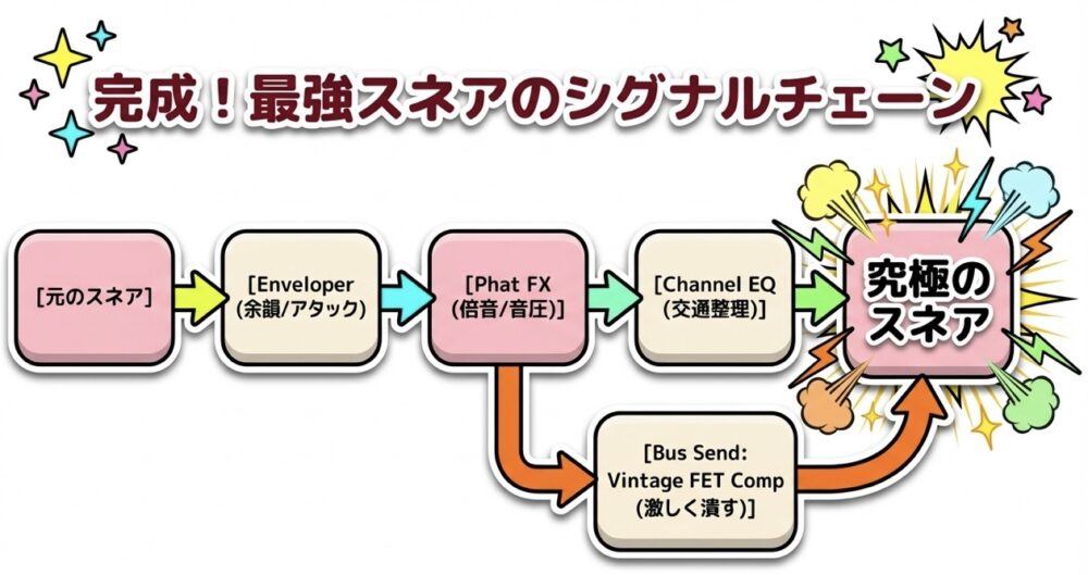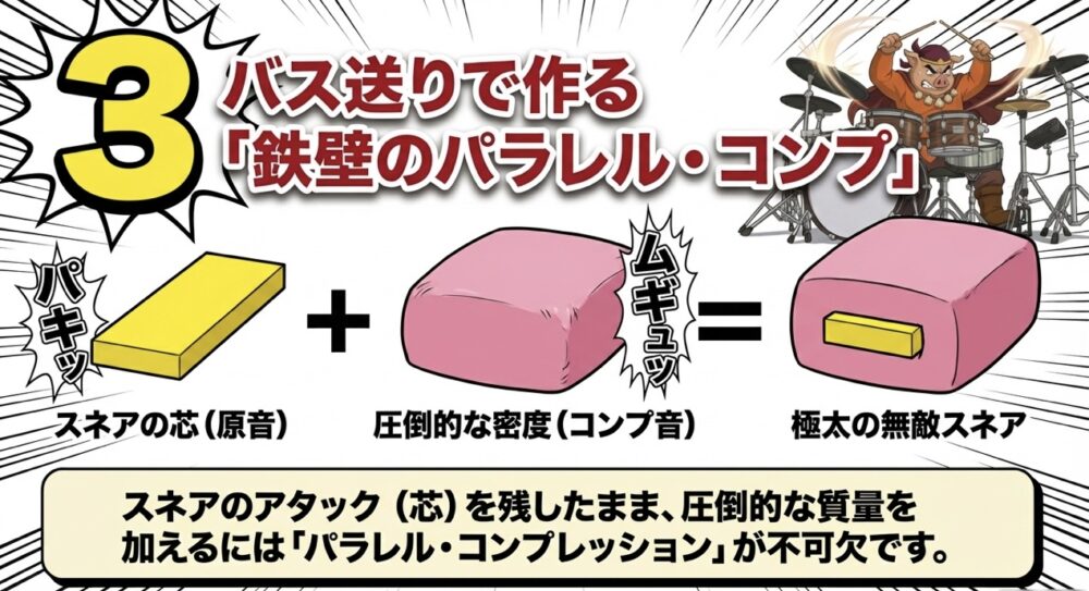 スネアのパキッとしたアタック(芯)を維持したまま、圧倒的な音の密度(質量)を加えたい場合、直列での処理には限界があります。