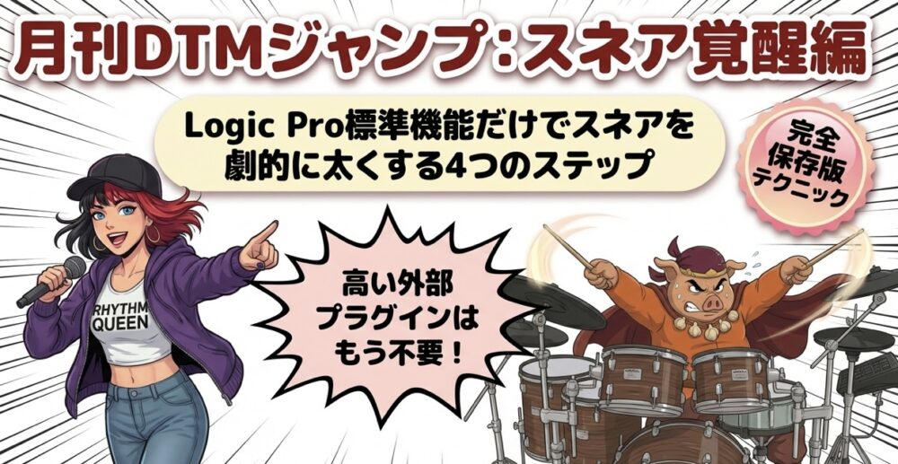 Gorilla Studio(ゴリスタ)https://finalappl.comGarageBand・Logic Proの創作研究所Sat, 21 Mar 2026 12:55:47 +0000jahourly1https://finalappl.com/wp-content/uploads/2026/03/cropped-Gemini_Generated_Image_ttm85zttm85zttm8-2-32x32.pngGorilla Studio(ゴリスタ)https://finalappl.com3232 有料プラグインは不要?Logic Pro標準機能だけでスネアを劇的に「太く」する4つの秘策【ゴリスタ】https://finalappl.com/logic-pro-fat-snare-stock-plugins/Sat, 21 Mar 2026 12:45:26 +0000https://finalappl.com/?p=22610