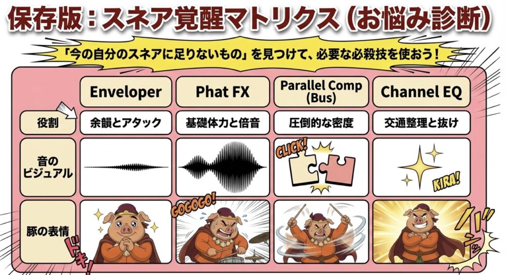 それは、元の音の「パキッ」とした質感を守りつつ、強烈なコンプレッションによる「ムギュッ」とした太さと粘りを共存させるためです。