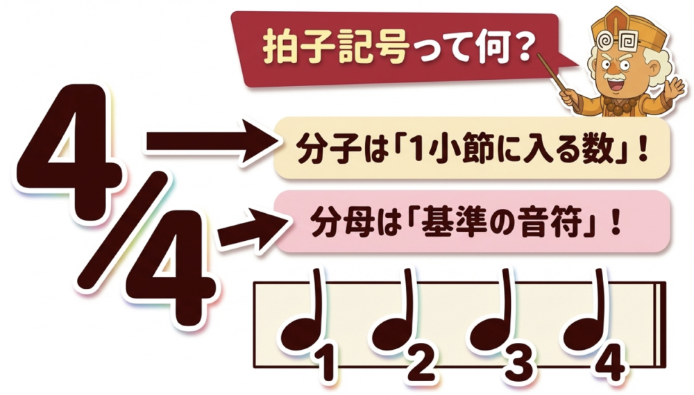 楽譜の最初、ト音記号やヘ音記号の横に「4/4」や「3/4」といった分数が書かれているのを見たことがあると思います。これが拍子記号です。