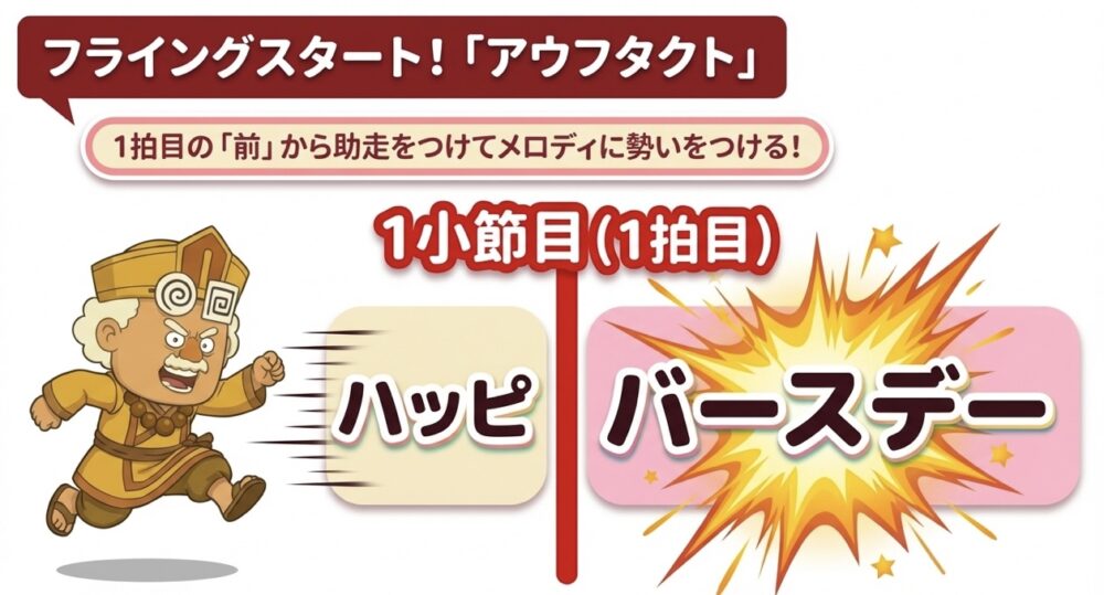 「(ウン)ハッピ・バース・デー・トゥ・ユー」 最初の「ハッピ」は準備運動のようなもので、本当の1拍目(強い拍)は「バース」の部分に来ています。