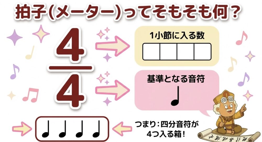 • 下の数字(分母): 基準となる音符の長さ(4なら四分音符、8なら八分音符)
