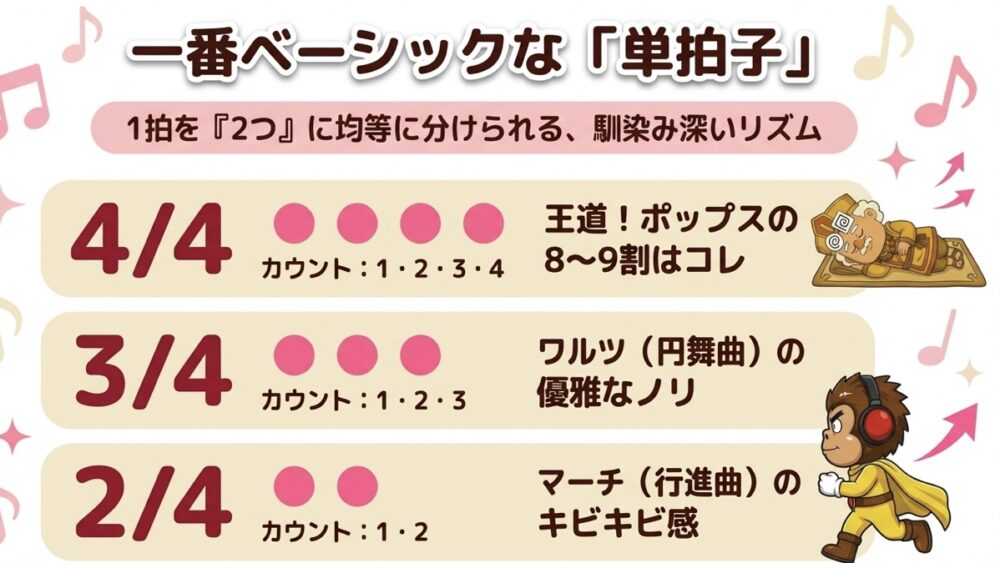 1拍を「2つ」に均等に分けられる、一番シンプルで馴染み深い拍子です。