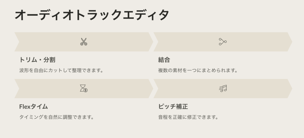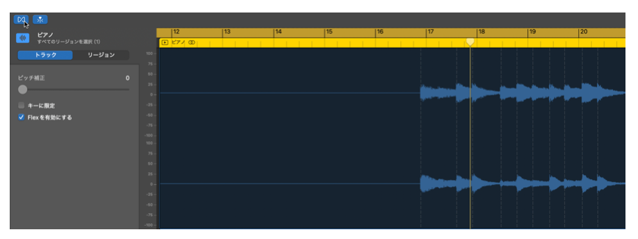 オーディオトラックエディタ:波形のトリム、分割、結合、Flexタイム/ピッチ補正