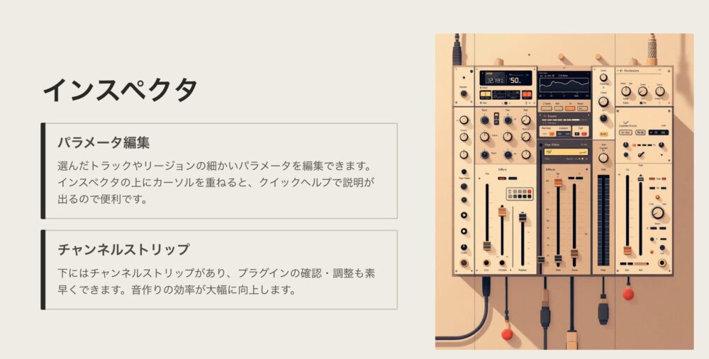 選んだトラックやリージョンの細かいパラメータを編集できます。インスペクタの上にカーソルを重ねると、クイックヘルプで説明が出るので便利。下にはチャンネルストリップがあり、プラグインの確認・調整も素早くできます。