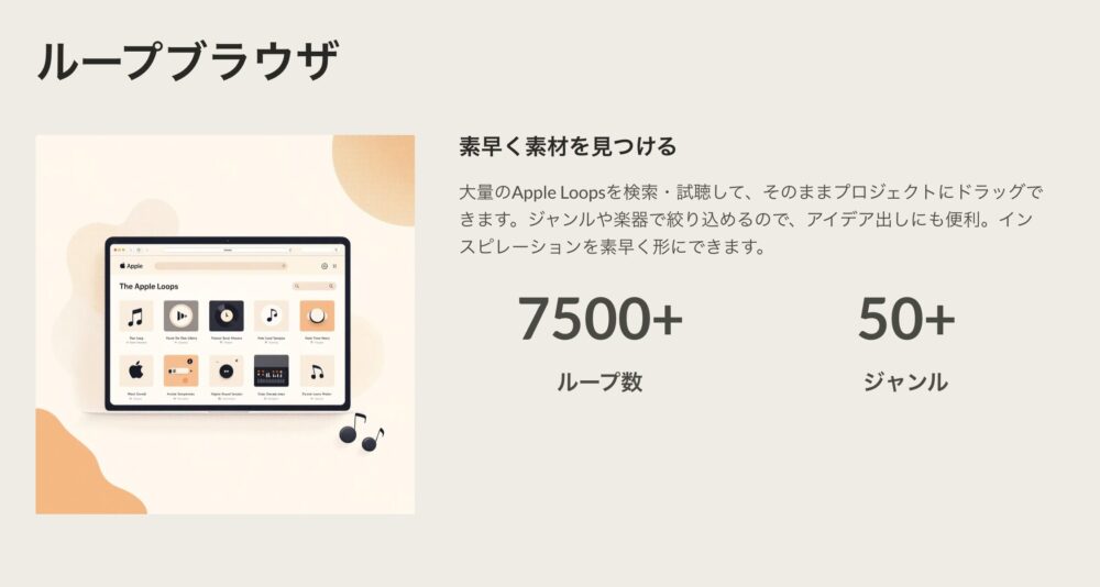 大量のApple Loopsを検索・試聴して、そのままプロジェクトにドラッグできます。