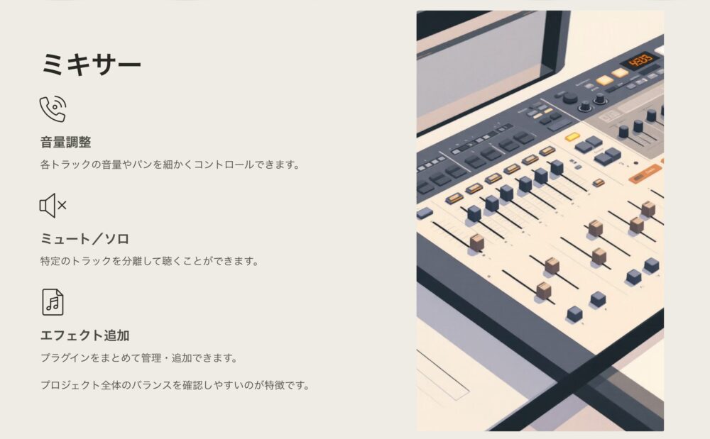 各トラックの音量やパン、ミュート/ソロ、エフェクトプラグインの追加などをまとめて行えます。プロジェクト全体のバランスを確認しやすいのが特徴です。
