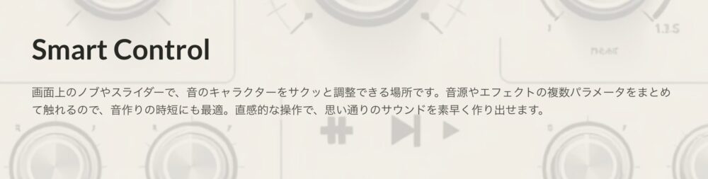 画面上のノブやスライダーで、音のキャラクターをサクッと調整できる場所です。音源やエフェクトの複数パラメータをまとめて触れるので、音作りの時短にも最適。