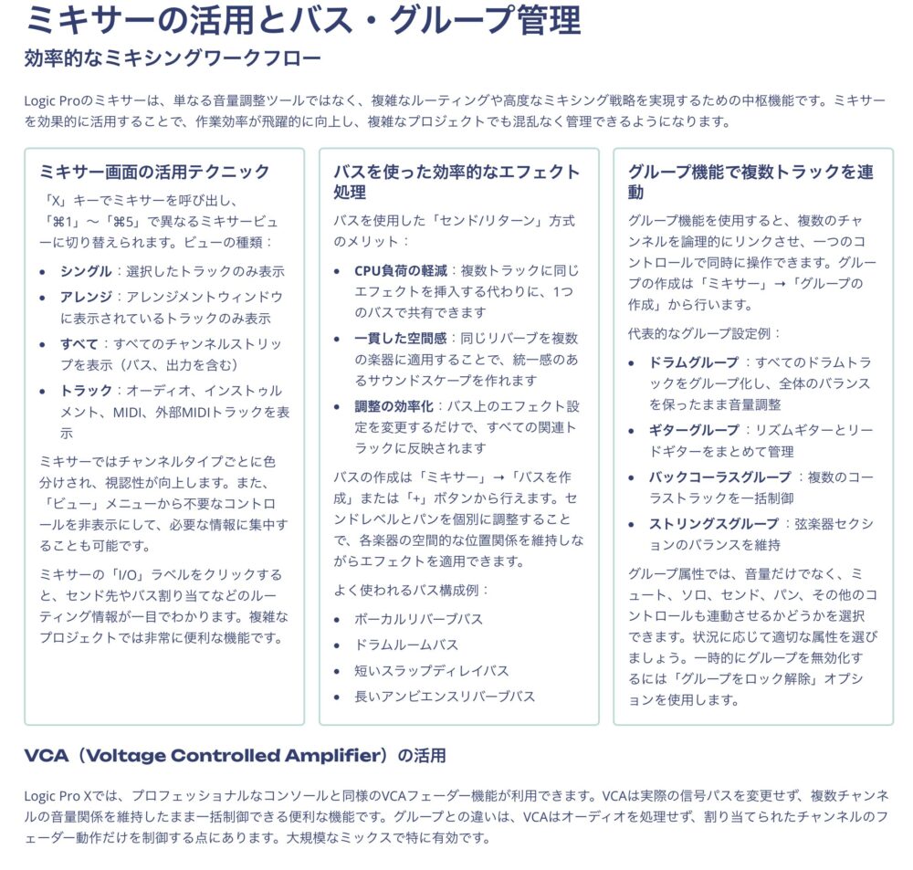 音楽制作の心臓部とも言えるミキシング作業。Logic Pro Xを使った効果的なミックス技術を基礎から応用まで徹底的に解説します。トラックの整理方法から各種エフェクトの活用法、2025年最新のテクニックまで、プロフェッショナルなサウンドを作り上げるための全てのノウハウをお届けします。初心者からベテランまで、Logic Proのミキシング技術を一段階上のレベルへと引き上げるための決定版ガイドです。