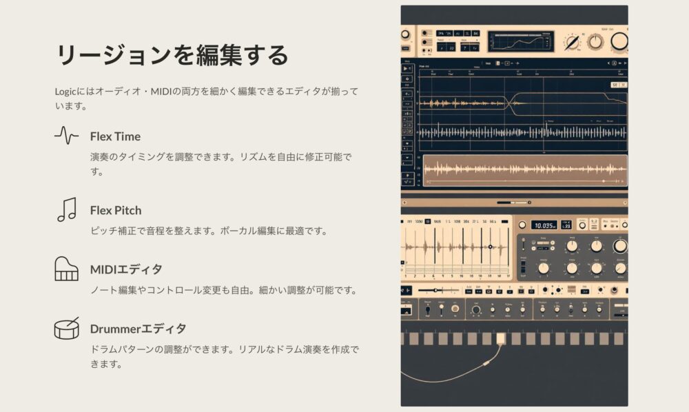 Logicにはオーディオ・MIDIの両方を細かく編集できるエディタが揃っています。