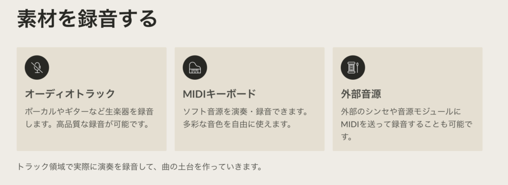 外部のシンセや音源モジュールにMIDIを送って録音することも可能です。