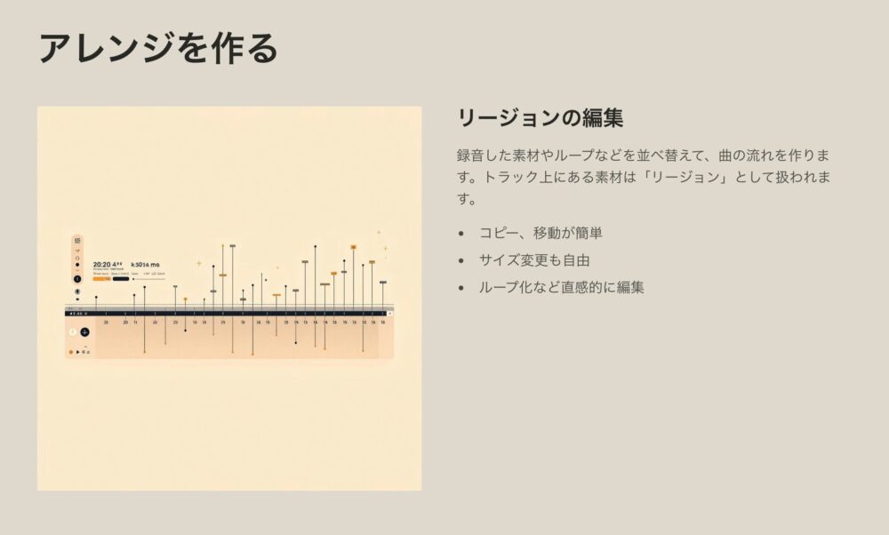 トラック上にある素材は「リージョン」として扱われ、コピー、移動、サイズ変更、ループ化など直感的に編集できます。