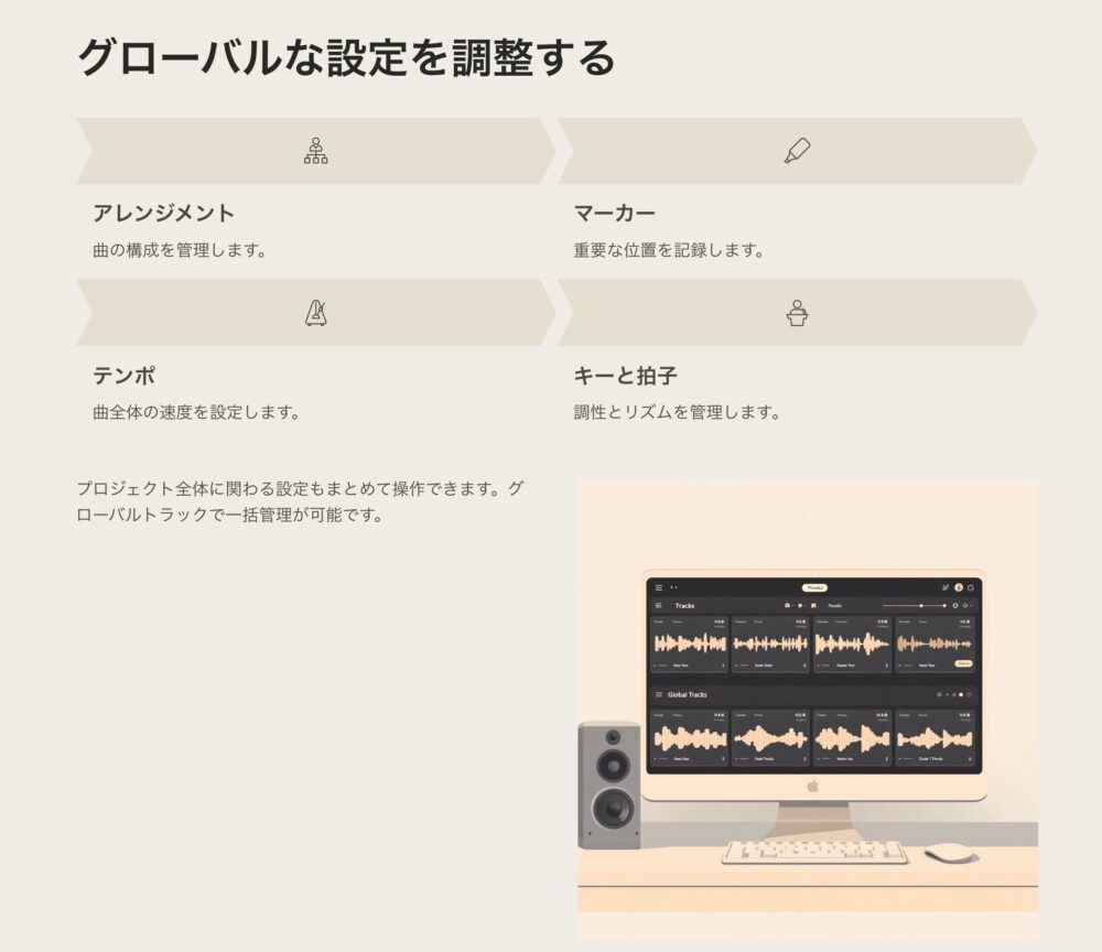 アレンジメント、マーカー、キーと拍子、テンポ、トランスポーズなどをグローバルトラックで管理。