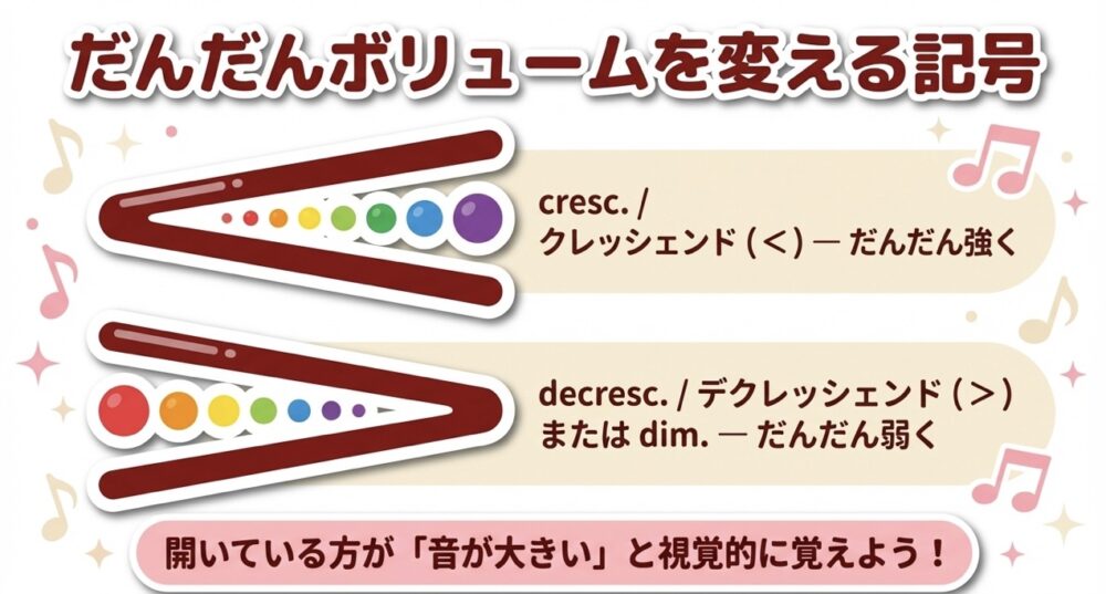 松葉杖のような「<」や「>」の記号は、開いている方が「音が大きい」と視覚的に覚えると簡単です!