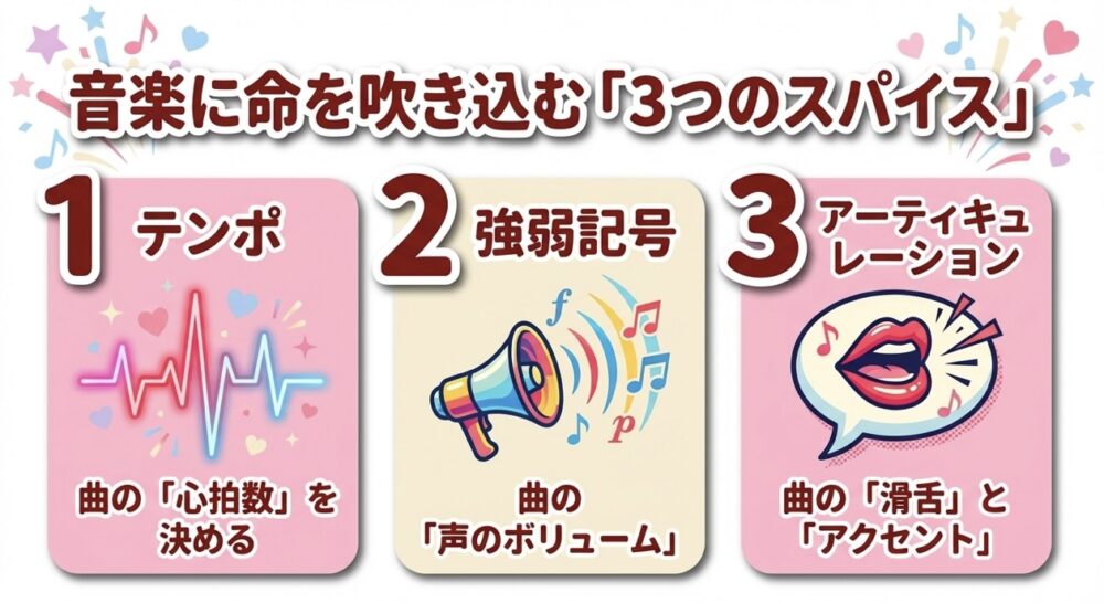 この記事では、音楽の基礎知識である「テンポ」「強弱記号」「アーティキュレーション」の3つを、初心者向けにわかりやすく解説します!