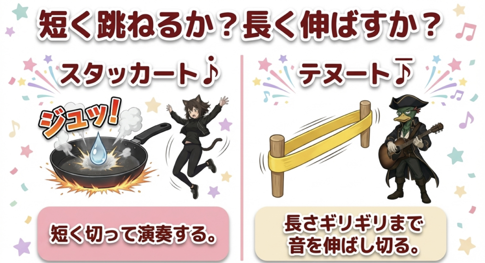 同じ「ドレミ」でも、跳ねるように弾くか、なめらかに弾くかで全く違う曲に聞こえます。