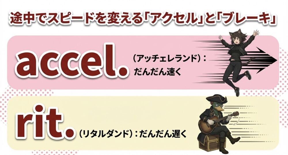 - accel.(アッチェレランド):だんだん速く(サビに向けて盛り上がるときなど)