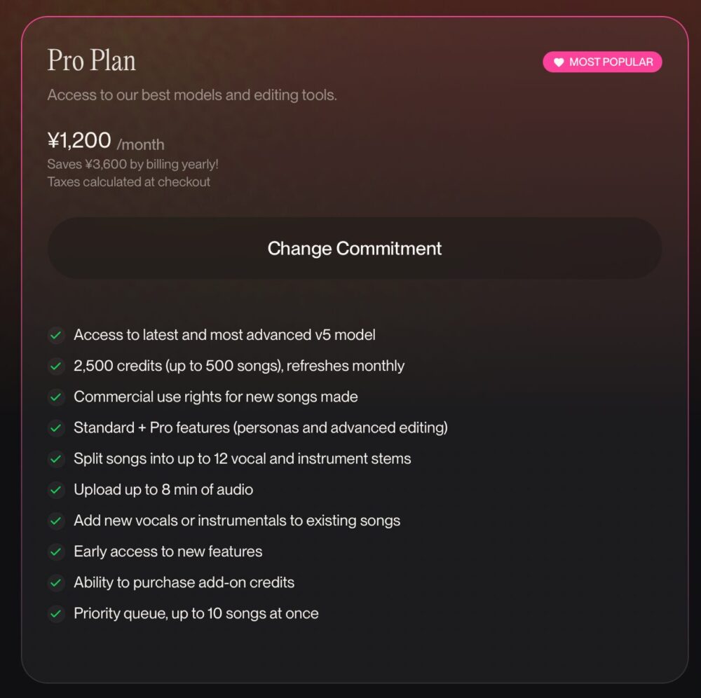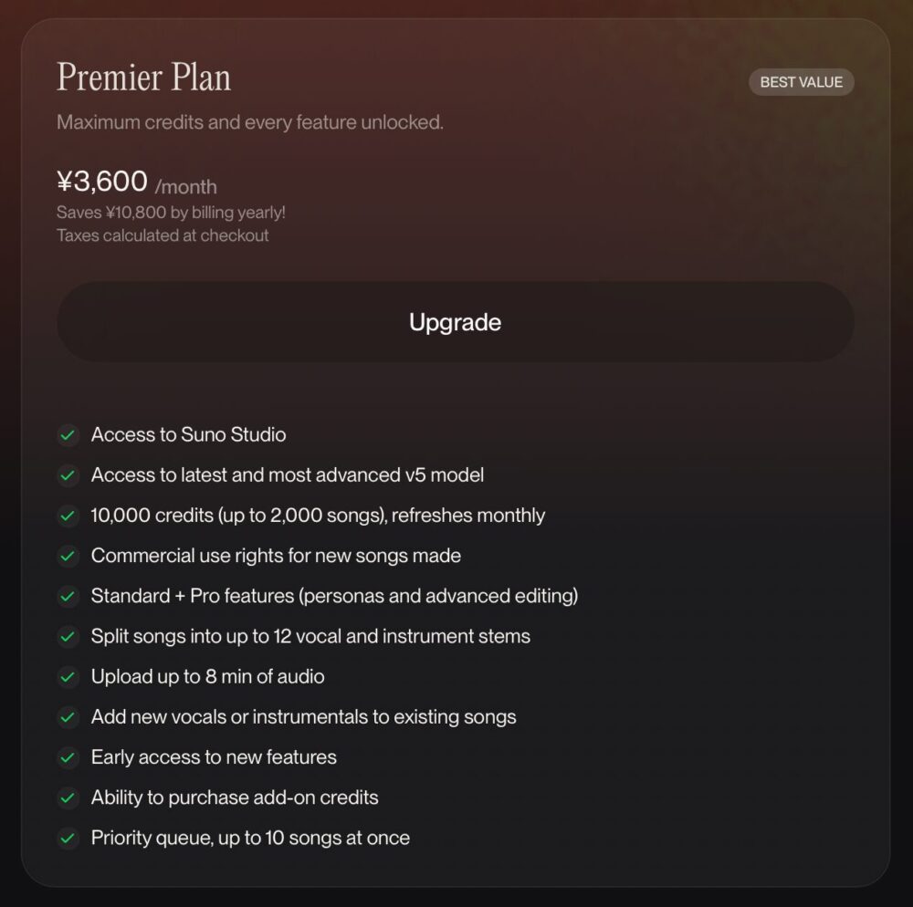 Suno AIでは、目的に合わせて複数のプランが用意されており、