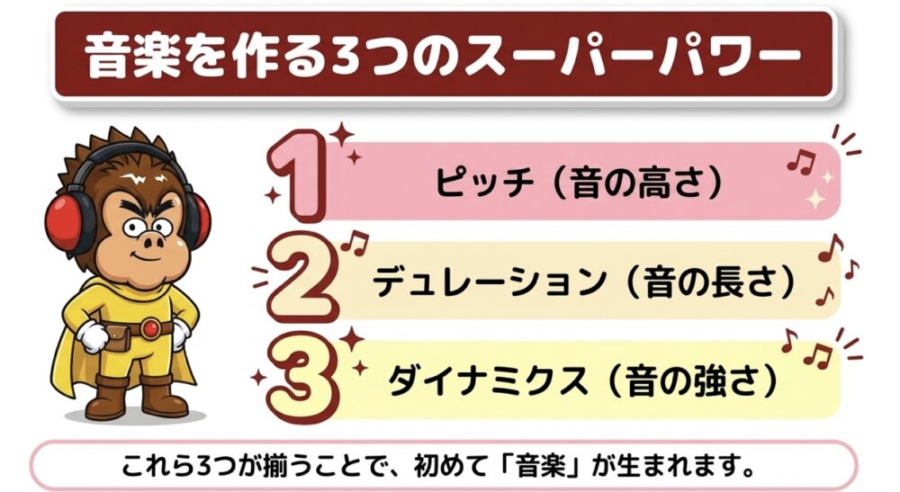 これら3つの要素は、どれか1つ欠けても私たちが知っている「音楽」にはなりません。