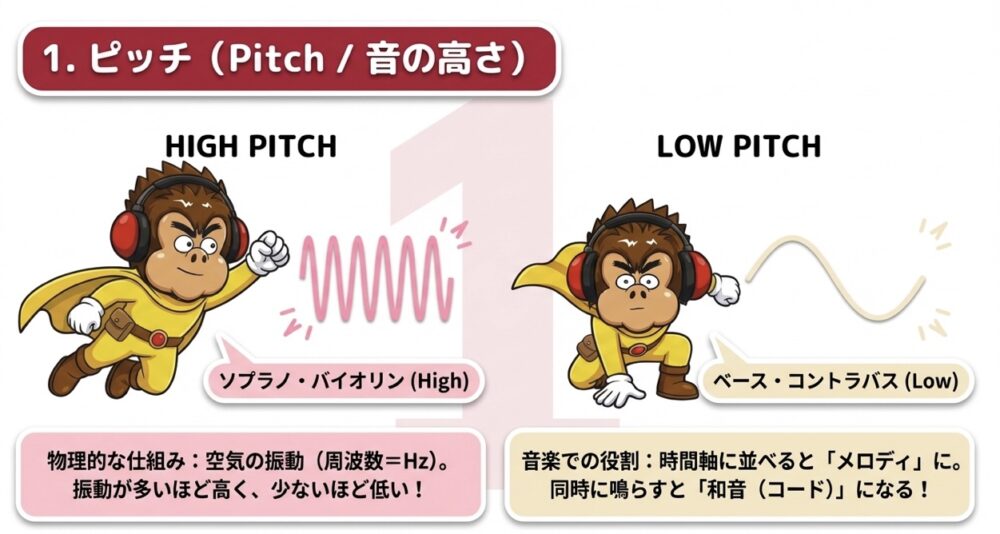ピッチとは、音が「高い」か「低い」かを表す要素です。